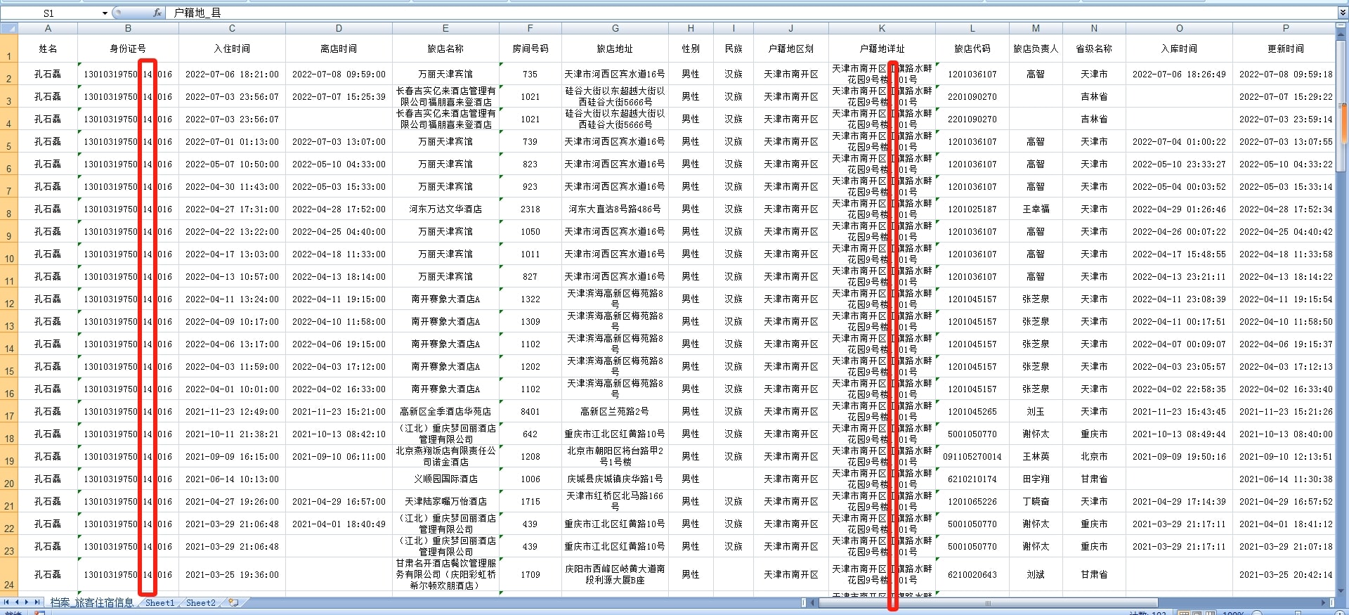 同住人的信息包括:姓名、性别、年龄、身份证号码、身份证地址、同住次数、文化程度、民族等。